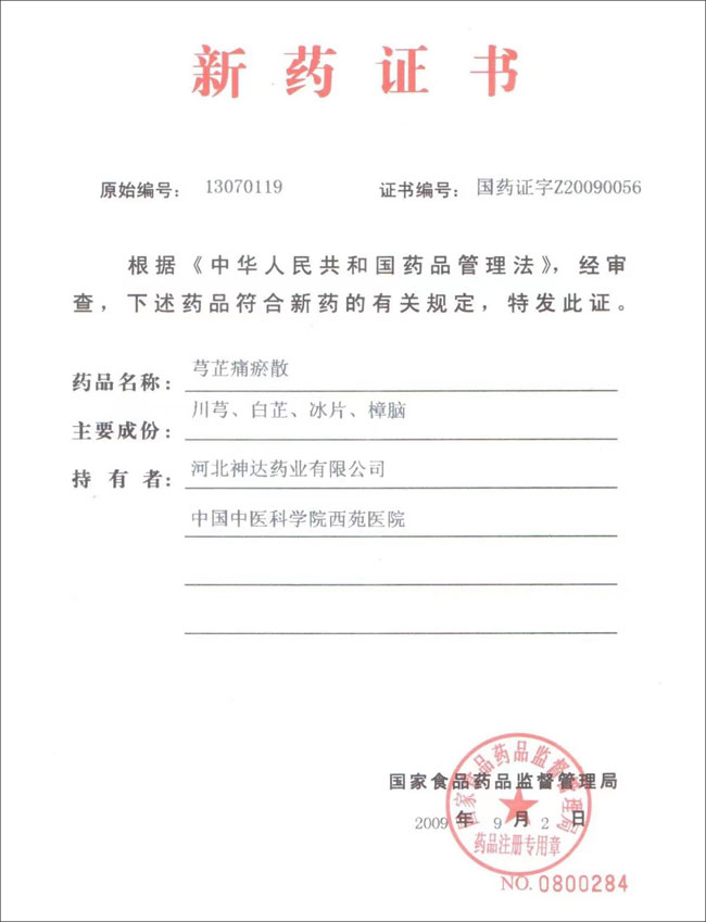 刘建勋教授对河北神达药业生产的芎芷痛瘀散进行了系统药效学研究,并优化了药品的生产工艺,对芎芷痛瘀散获得国家级奖项做出了突出贡献。